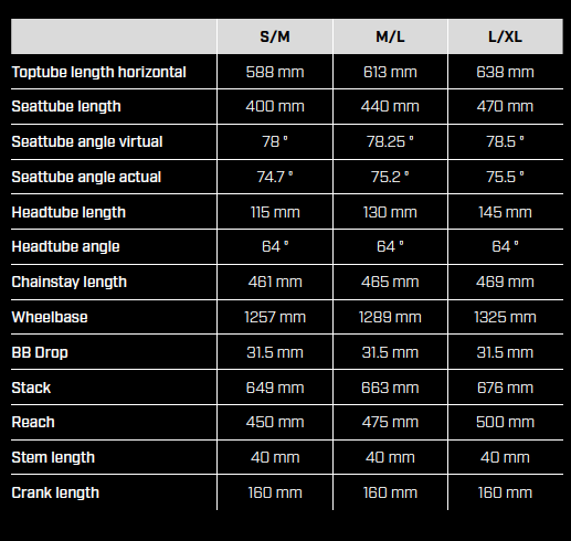ECC-sykkelen får 29-tommer hjul foran og bak, og henholdsvis 170 og 160 millimeter vandring foran og bak. Geometrien skal være såkalt «racing optimized», og det vi leser av geometritabellen er at sykkelen (ikke overraskende) er både lang og slak.