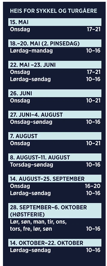 Høgevarde sin shuttlebuss begynner å gå 22. juni (stiene åpner 1. juni), og heisen i Hemsedal går fra 22. juni, og på Geilo fra 6. juli.