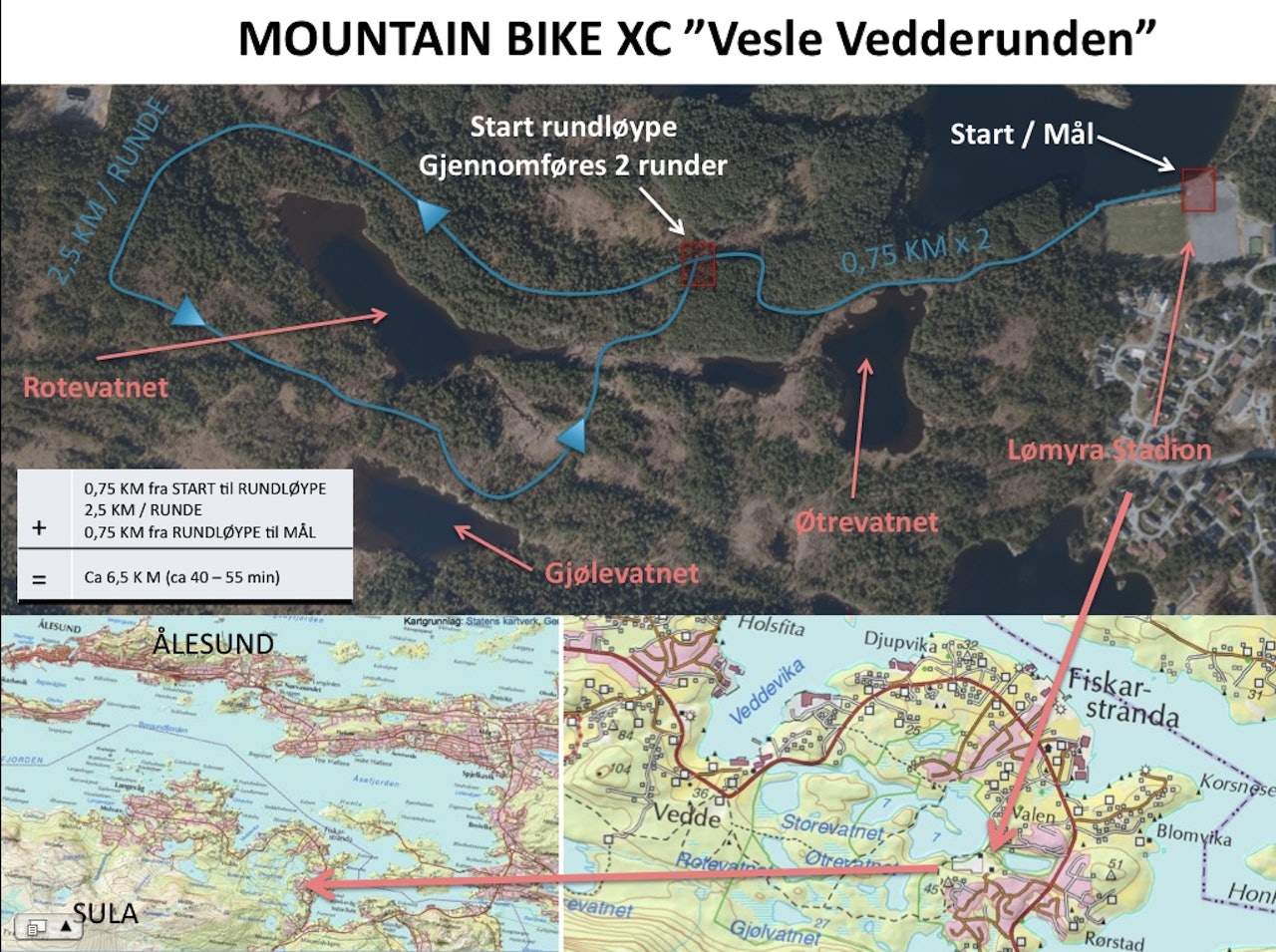 Start Lømyra Stadion. Herfra går det ca 280m i motbakke inntil du ankommer et kryss. Ta til høyre (følg skilting mot VEDDE). Følg deretter gule prikker på trærne til du ankommer Gjølevatnet. Her tar du til venstre i første stikryss etter Gjølevatnet. Du vil da retunere til start for rundløypen (Vesle Vedderunden). Etter 2x Vesle Vedderunden følger du samme vei tilbake til Lømyra Stadion. Hans Peter syklet 19.07.12 løypen på 39 min 50 sek. Gjennomsnittsfart var 10,07 km/t med maksfart på 29,18 km/t.