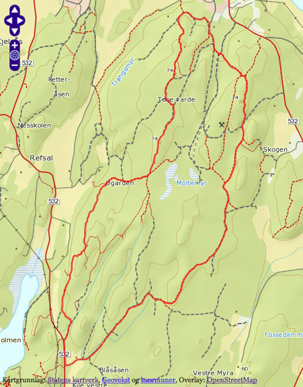 Ta venstre inn på skogsbilveien og høyre etter 10m, høyre etter den hvite bruaog følg skogsbilveien til snuplassen.Denne ligger i enden av en vei med adresse Toresmyr, som du kan kommeinn i fra Holm, hvis du har parkert ved kirken.Fra snuplassen skal du vestover på den gressgrodde skogsbilveien.Følg denne opp i høyden og når skogen åpner seg stikker det en stiinn på venstre side som kan være vanskelig å se.Etter 500m klatring (6% stigning) kommer du til Thorsøvarden,hold rett frem og høyre inn på skogsbilvei og til venstre på en mindre stikksti etter 200m.Sving høyre og fortsett klatringen opp til lavvoen.