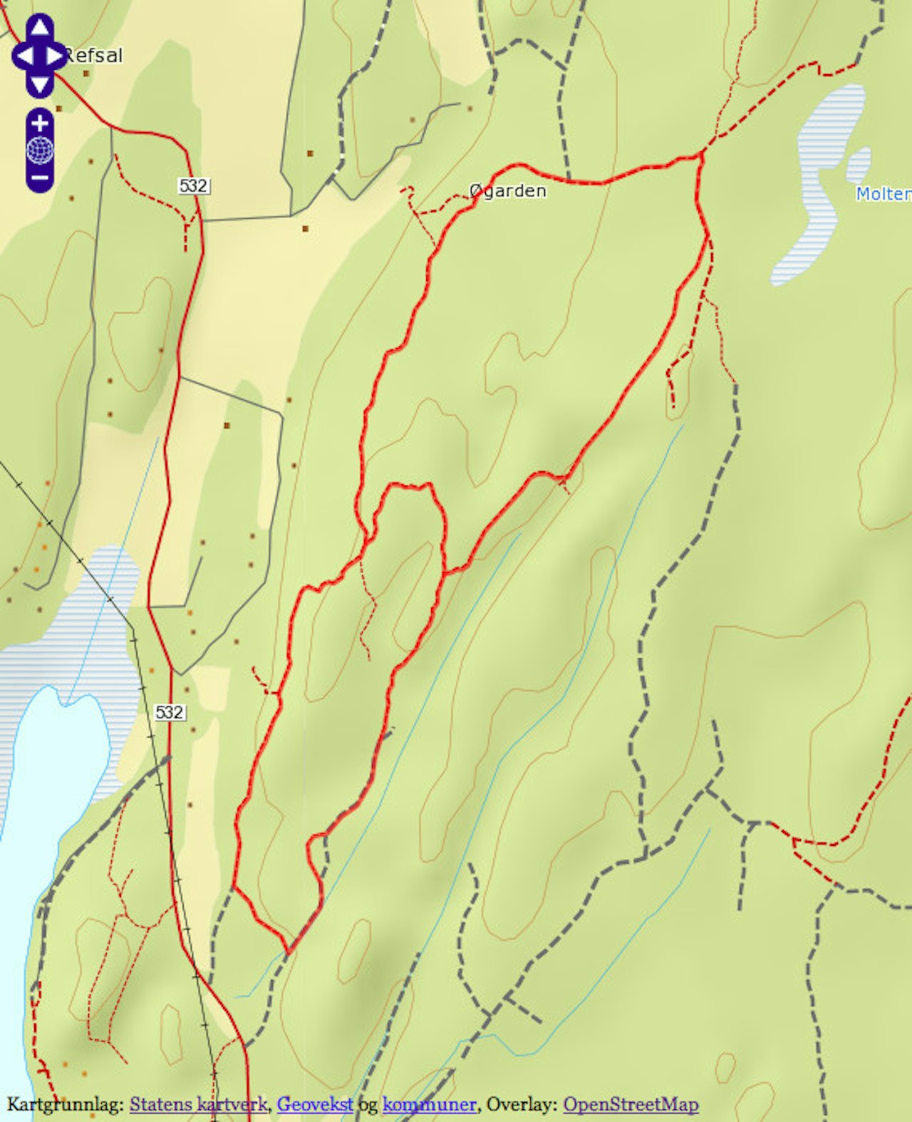 En gang til?For å forlenge den og kjøre det morsomste partiet en gang foreslår jeg å finne igjen en bitteliten sti som følger Vestre Grandalen tilbake til Tose varde og deretter Ødegårdsfjella en gang til. Se kartutsnitt.