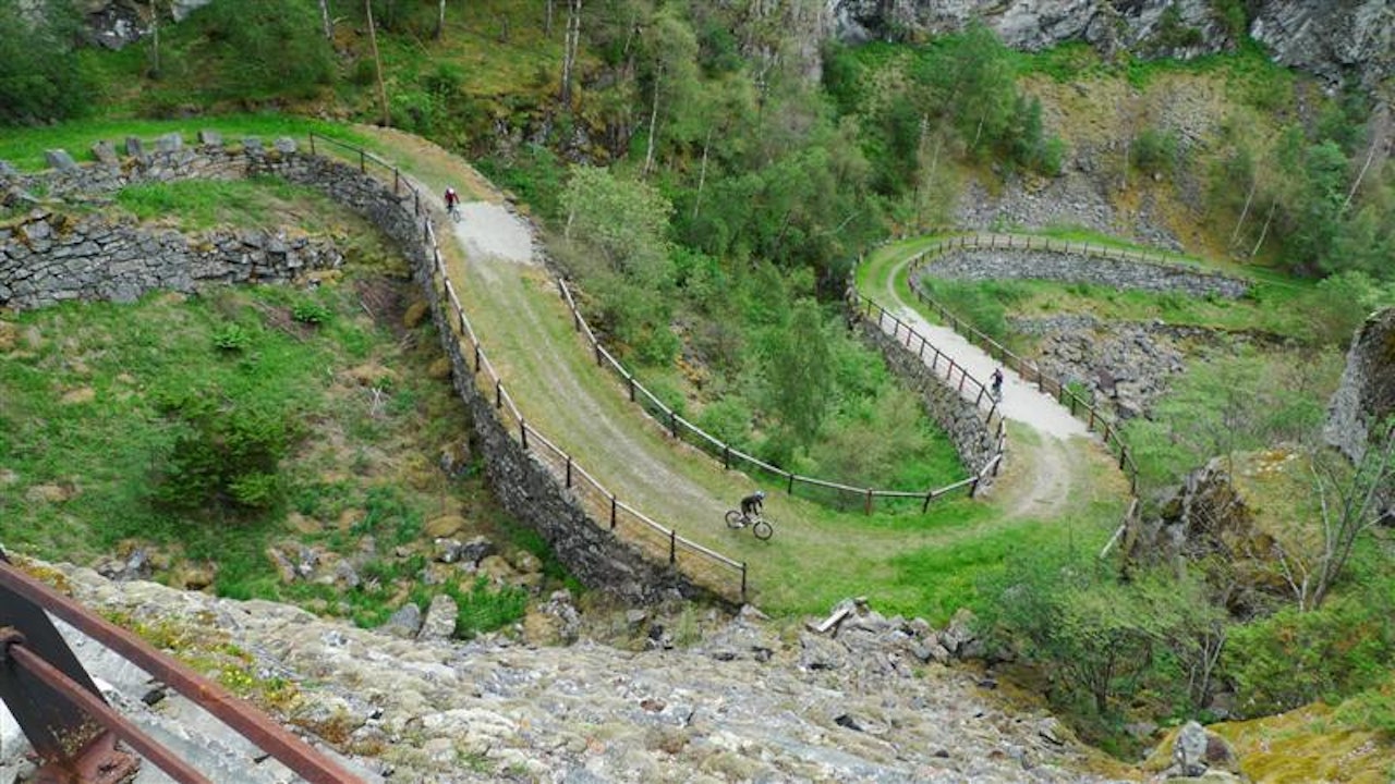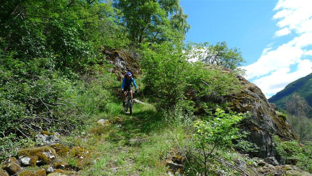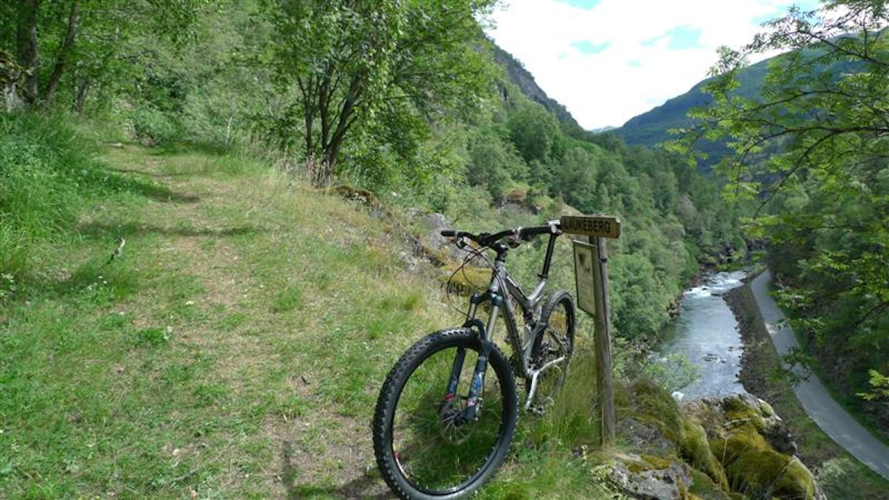 Stisykling langs kongevegen fra Hemsedal til LærdalKanskje den flotteste sykkelturen fra Hemsedal er å følge den gamle kongeveien til Lærdal. Denne har en kombinasjon av flott singel track, historiske veier, traktorveier og asfalt. Start på Hemsedalsfjellet ved Breistølen og sykle ned til Lærdal. Turen går langsmed Lærdalselva og er en storslagen naturopplevelse, er kanskje mere vaffelkoselig en teknisk krevende, men mye fin lettsyklet sti nedover, og en del asfalt innimellom. Blant annet er det en opplevelse å sykle ned den bratte og svingete Vindhellavegen bygget opp en gang på 1700 tallet. Turen anbefales som en dagstur fra Breistølen og man kan ta bussen tilbake fra Skysstasjonen i Lærdal på ettermiddagen ved 15-16 tiden. Anbefales ikke på søndager da bussen kan være full og det er vanskelig å få med sykler.Parker på Eldrevann eller Breistølen.Sykle første bit på RV52 på asfalt til første 180gr venstresving nedenfor Breistølen (Bilde 1, 2). I denne svingen ta rett frem inn på sti. Denne slutter i en veiskjæring. Kryss riskveien og løft sykkelen over autovern hvor stien fortsetter på nedsiden av riksveien (Bilde 3). Stien går etter hvert over til grusvei, følg oppover og kryss pånytt riksveien. Sykle gjennom stølsgrend Bilde 4) og fortsett merket sti nedover mot Borlaug, fin stisykling (Bilde 5).Hvor du kommer inn på RV 52 igjen dvs 100 m før krysset til Borlaug følger du sykkelskilt til Lærdal. Du sykler nå på vestsiden av elven på grus og senere asfalt vei til Bjøråk hvor du krysser elven inn på den gamle riksveien.Sykle videre på den gamle riksveien til Steinklepp hvor du igjen kan følge merket sykkelvei videre. Denne går sammen med den gamle riksveien igjen 1 km før Borgund Stavkirke.Etter 700 m dvs 300 m før Borgund Stavkirke tar du av veien mot høyre og følg stien som er skiltet “Vindhellavegen” til merket sti (Bilde 6). Sykler bratt oppover 150 høydemeter før du står på toppen av den historiske konstruksjonen Vindhellavegen med serpentinsvinger og smijernsrekkverk (Bilde 7, 8) nedover til Husum.Sykle så nesten 1 km på riksveien og ta sti til høyre ved Slettgagen, dvs rett før riksveien krysser over til sydsiden av elven (dvs rett før broa vist på Bilde 9). Følg sti vider på nordsiden av elven, denne starter opp ei bratt kneik til høyre for svaberg. Stien går forbi Galdane som er det kanskje fineste stipartiet på turen. og mye flott natur, Bilde 9-12). Stien ender etter en stund på en ”blid vei” i form av en gammel sammenrast bro. Sykle tilbake opp bakke 100 m å se etter sti som tar av til høyre. Her er det for øvrig fint å gå langs de konstruerte laksefisker stiene ved elva. Stien her har lange fine flytparti og noen kortere tekniske partier.Fortsett sti til du kommer ut på riksveien igjen ved Seltun. Her kan du også ta buss eller fortsette videre ca 12 km på asfalt til Haabakken og Lærdal skysstasjon.Mulig man kan krysse broen over til sørsiden av dalen ved Hønjum og følge sti/traktorvei et stykke her, men dette har jeg ikke prøvd.