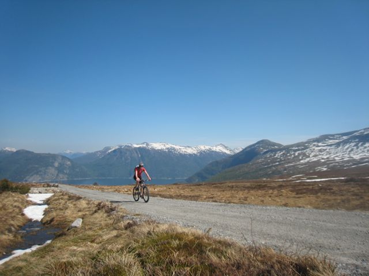 Fra grustaket sykler du asfaltvegen vestover mot Meisal, rett før bygda ender tar du inn på grusveg som du følger opp 5-600hm til Meisalvatnet. Se ellers stiguide for Prestaksla for adkomst.Fra parkeringsplassen går det fin sti gjennom hyttefeltet, ca midt i hyttefeltet ser du konturene av stien på høyre hånd opp på Eidshaugen. Trask opp hit, tar ca 1/2t. På toppen nyter du utsikten og hiver i deg noen rosiner før du setter kursen nedover stien. Den ender ved parkeringsplassen. Kryss broen over elva som renner ut av Meisalvatnet og følg stien videre forbi et par hytter. Ta IKKE stien inn mot blåfjellet, men forstett på den bredeste stien. Stien dreier mot venstre, og krysser en bekkedal, her tar den til venstre nedover paralellt med bekkedalen i nordlig retning. Etterhvert blit den tidvis utvasket, og tidvis noe utydelig, men slettes ikke umulig å følge. Vi har prøvd å tette de verste OTB-hullene. Fortvil ikke over stiens karakter, etter et par hundre høydemeter med sauetrakk og noe bløtt underlag kommer en ned i åpen furuskog og siden bjørkeskog, slipp bremsene og la det stå til. Når du kommer til granskog og sti/stølsvegen tar mot venstre skal du rett fram i granksogen på sti, fortsett rett ned gjennom granskogen og siden åpen furuskog ned til en støl. Ta inn til høyre gjennom grinda og følg stien ned. Du kommer straks til ei grind til, så fortsetter den raske stien ned mot fjorden. Ned på riksvegen tar du denne til venstre og tar inn på første asfaltveg oppimellom husene. Følg denne paralellt med fjorden, og ta opp på grus/traktorveg mot Meisalvatnet igjen når sjansen byr seg, eller shuttle med bilen du har vært smart og parkert nede ved fjorden.Det er mulig å trakke seg t/r Eidsvåg på grusveg. Norgeskart.no
