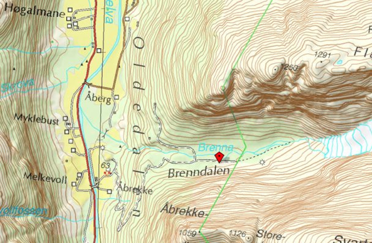 Køyr bil til Aabrekk og parker på anvist parkering rett over brua frå FV 724. Sykle gjennom tunet og inn på traktorvegen til Brenndalen.
