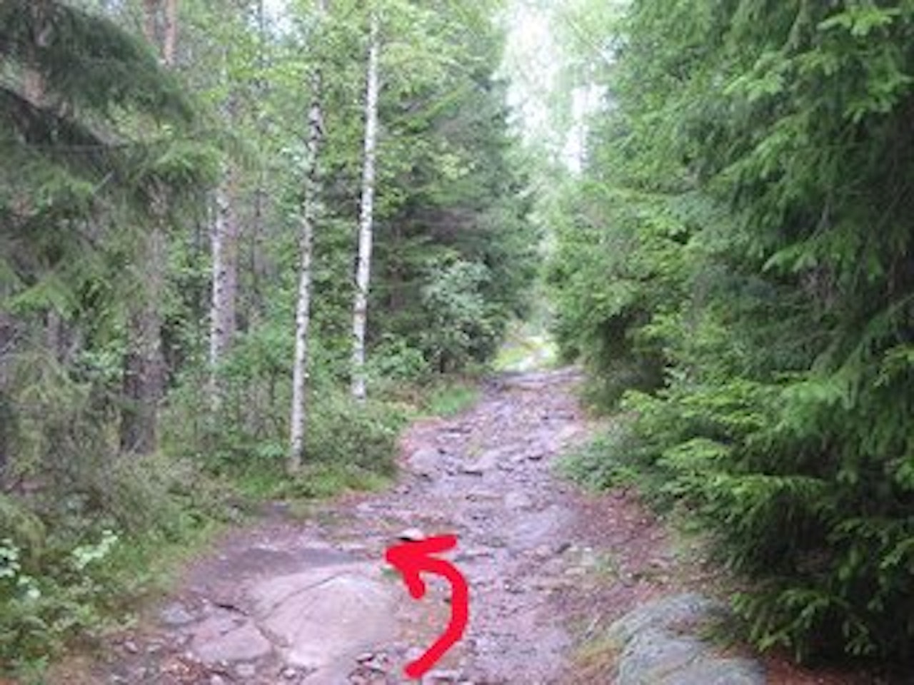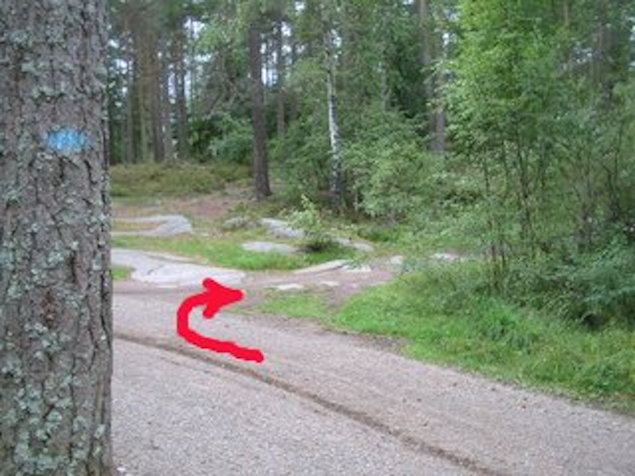 Ved et rødmerket tre (bilde fire) går stien vi nå skal følge oppover til høyre.Svabegene er veldig glatte såprøv å styr unna dem!Du kommer etterhvert til noen fine klatringer på svaberg og kjøret rundt en høyspentmast.På toppen går det mot et drop som,(jeg tror) kan tas uten at kranken går nedi,eller ufarliggjøres ved å kjøre til venstre for det. Derfra går det flatt og nedover(nedover ganske smalt) til grusveien.Ta grusvegen du kommer ut på til venstre og følg den til bommen ved hestegården.