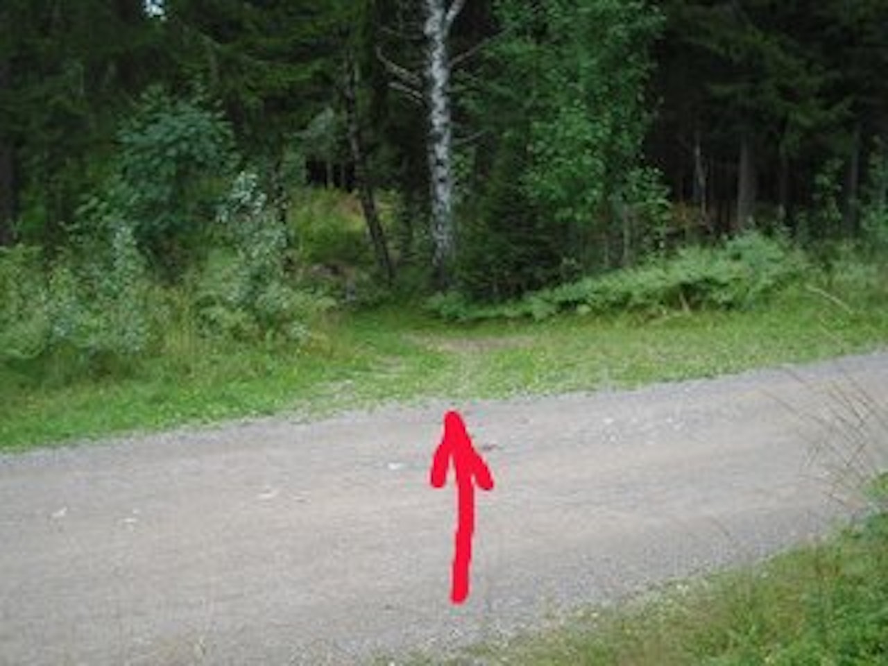 Snart kommer du ut på grusveien.Kjør rett over og litt til høyre(bildenr. tre).Du skal gjennom en sjikane og deretter følge en noe teknisk sti bortover.Ikke ta av noen steder.Det kommer en liten elv med dårlig bro, noe bekk, slakt opp og ned og et litt vel smalt parti.Når du kommer ut på grusveien svinger du til venstre og følger den rundt den slake svingen.
