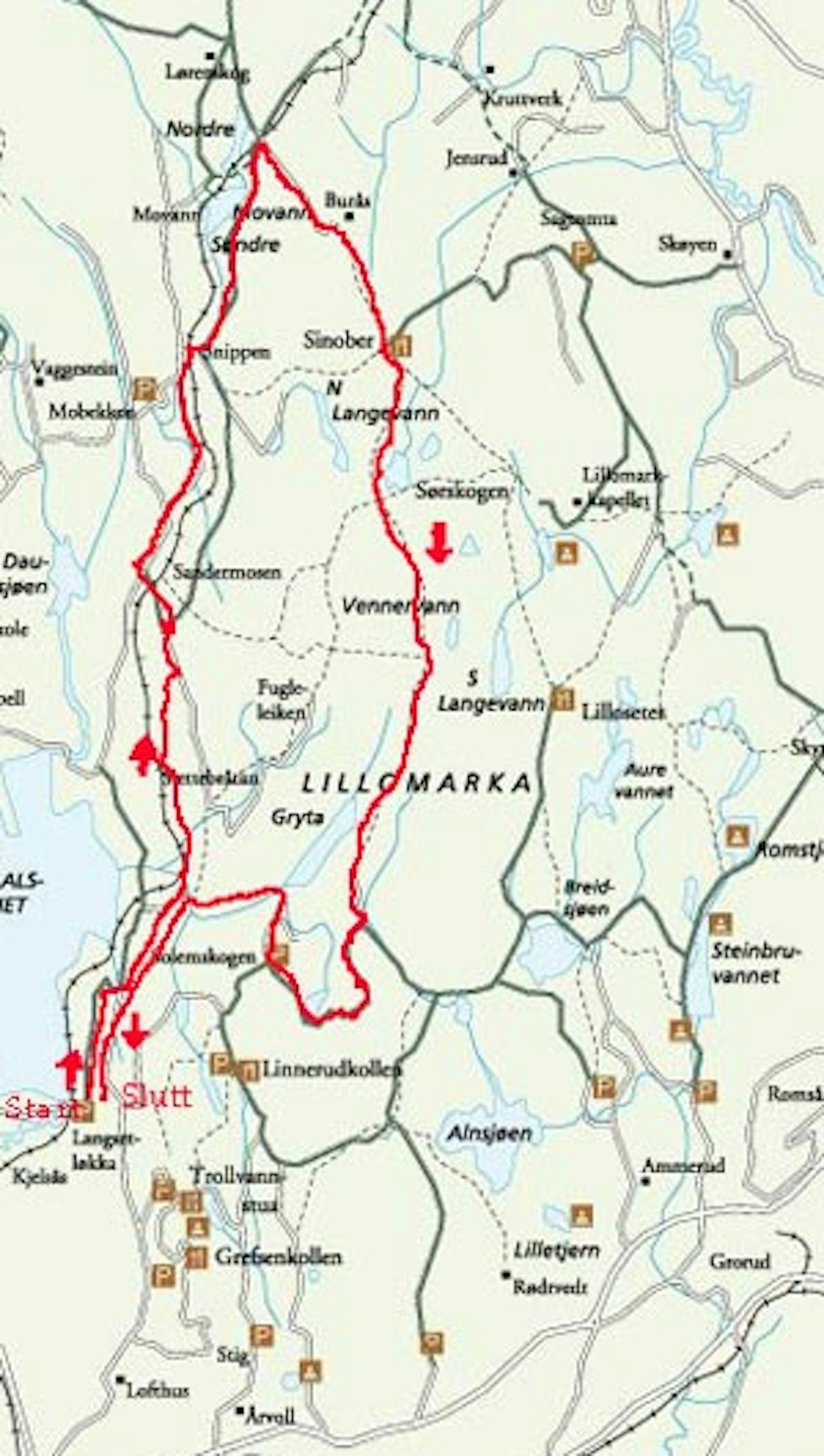 Fra demningen ved Maridalsvannet sykler du langs grusveien på oversiden av vannet et par hundre meter til du kommer til et veiskille. Til høyre kommer du til Linderudkollen, til venstre havner du samme sted som vi skal, men vi velger å ta stien rett frem (bratt oppover). Dette er en skiløype om vinteren, så den kan være litt fuktig etter regnevær.