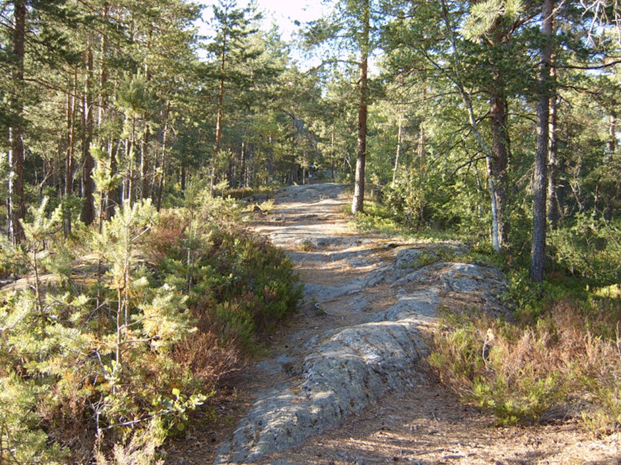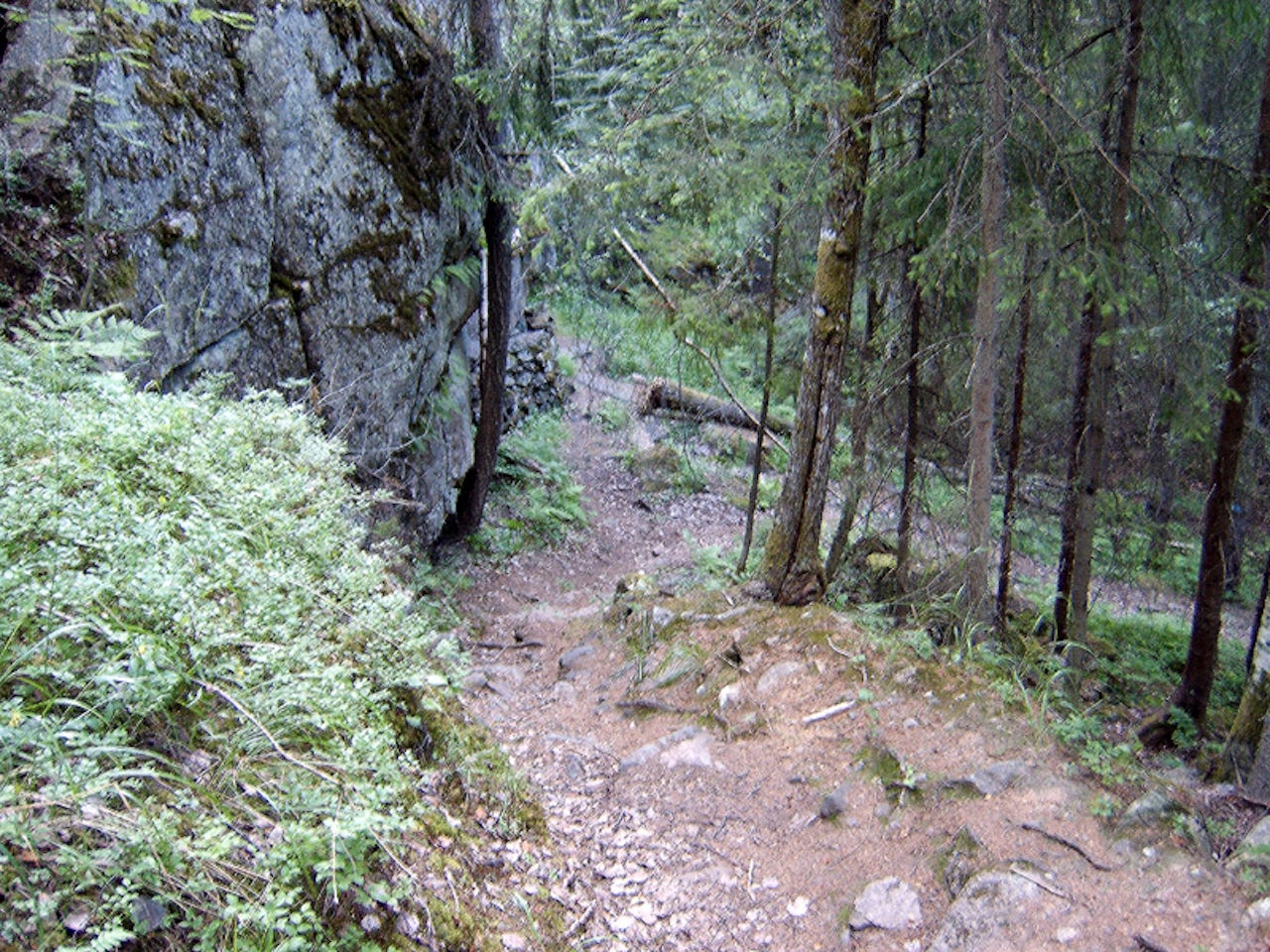 Etterhvert blir det en del morsomme nedoverbakker, og deretter barnåldekket sti gjennom ganske mørk skog. Ved ca. 1,5km møter man en rødsti som kommer opp fra sør. Følg blåstien nordover (blå og rød går sammens her et stykke), og ta av på blåstien igjen når det begynner å gå oppover på nytt. Her er de siste bakkene opp til Haukåsen.