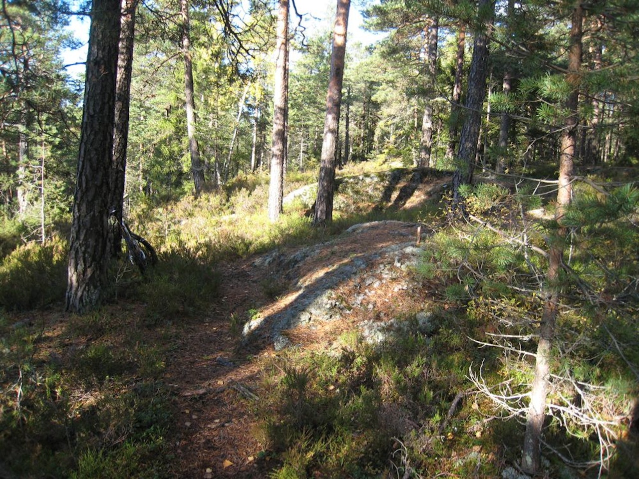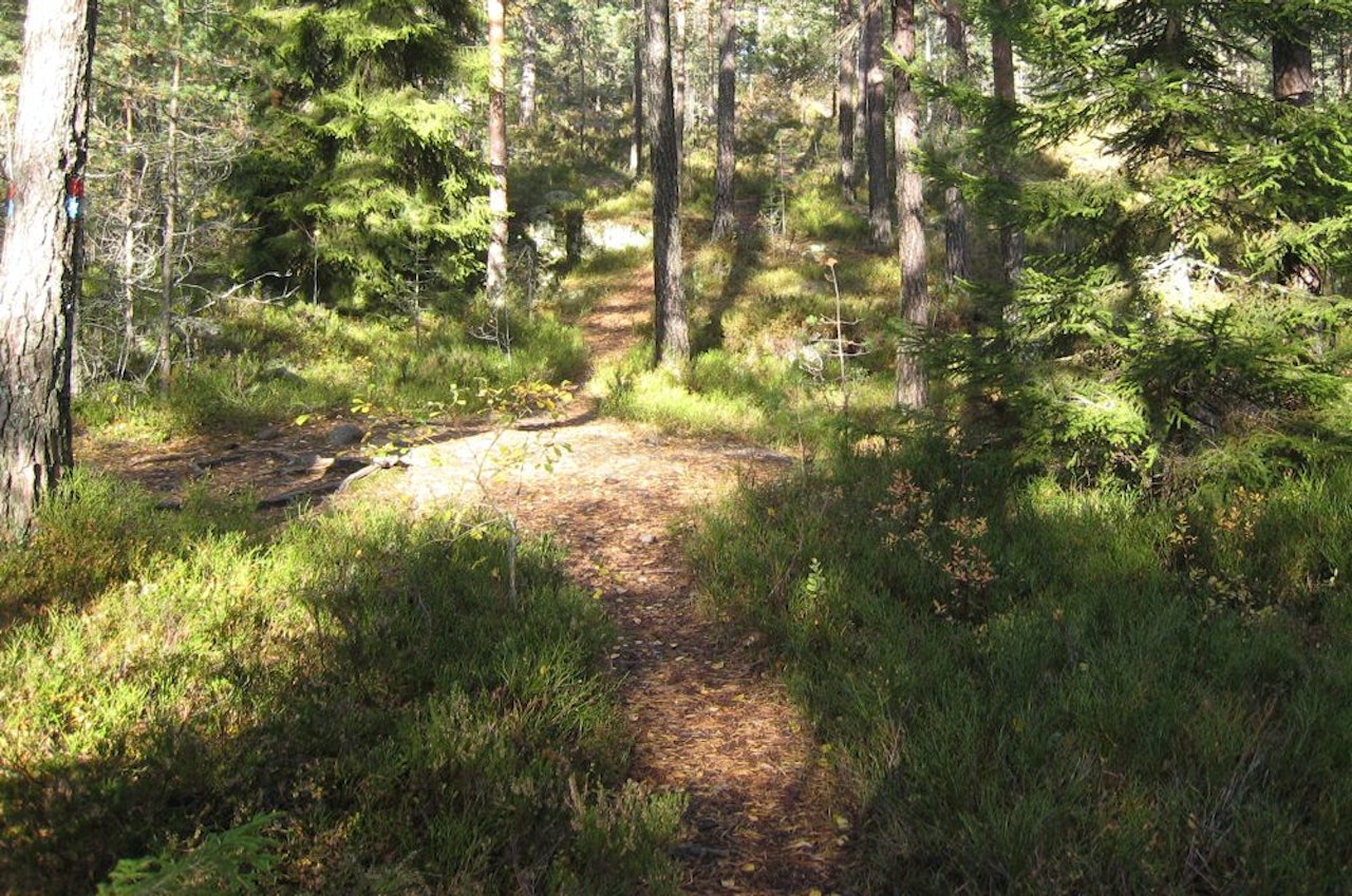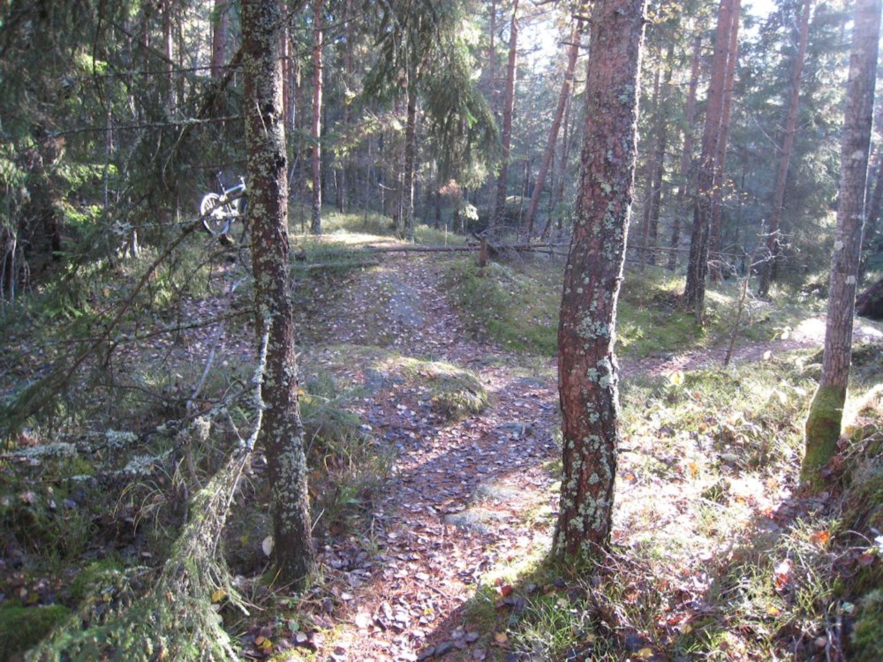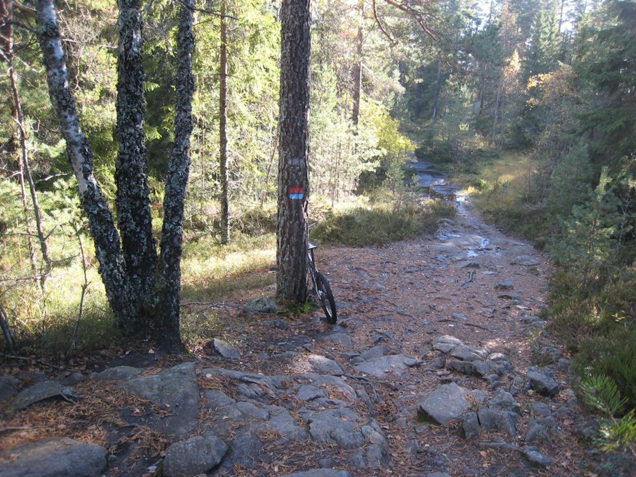 <b>Opp mot Skullerudåsen</b>På vestsida av Rundvann, i enden av grusveien rundt vannet, skal du opp den brede stien på venstre hånd. Følg stien ned en steinete bakke, ta så til høyre og følg stien videre over noen klopper. Den brede stien fortsetter over to smale, parallelle planker. Her er det stor fare for å sette forhjulet i midten. Når du har passert plankene, skal du bratt opp mot høyre, nordover.Denne stien er vanskelig å få øye på, så her må du følge godt med. Stien som snor seg oppover i lyngen, ender snart på et stort svaberg. Dette skal du krysse før du fortsetter på smal sti i andre enden av berget. Snart kommer du til et stikryss som er vanskelig å få øye på. Her skal du oppover til høyre, altså mot øst, og etter hvert inn på et nytt stort svaberg. Dette skal du også krysse. På toppen av berget skal du inn på stien mot venstre. 100 meter lenger nord kommer du til en bred sti.Den brede stien du nå har kommet inn på, er traseen for utforprisen i Terrengsykkelrittet. Denne skal du krysse, og den smale stien fortsetter bratt oppover mot flaten på toppen av Skullerudåsen. Etter 200 meter heller stien bratt nedover mot venstre, men her skal du i stedet opp en liten kant mot høyre (bilde 2). Følg stien når den svinger mot venstre, og så brått mot høyre igjen. Følg stien videre 100 meter mot sørøst før den svinger til venstre ned et bratt crux. Her må nok de fleste trille litt, men etter 30 meter er det bare å kaste seg på sykkelen igjen. Snart kommer du til en bred sti, nemlig hovedstien over Skullerudåsen.<b>Rundt Fugleleiken</b>På hovedstien skal du ned mot høyre, men denne stien skal du ikke følge lenge. Bare noen meter sør for der du kom ut, står det en furu merket med en rød og en blå stripe. Her skal du nemlig inn på den smale stien mot venstre (bilde 3). Her er det bare å følge stien, som etter hvert krysser en bekk og fortsetter videre oppover åsen.Snart kommer du til en flate med utsikt over myra Fugleleiken i nordvest. Her er det bare å følge en av de mange stiene ned mot høyresida av myra. Etter hvert som du kommer nærmere Fugleleiken, forsvinner svabergene, og stien blir mer preget av fin jordbunn dekket med barnåler. Fra nordenden av Fugleleiken fortsetter stien videre mot myra Dokkemåsan. Følg stien langs Dokkemåsan til du treffer en bred, blåmerka blanding av sti og bekk. Følg denne nedover mot nord et lite stykke til den ender opp midt i Fjelstadbakken.<b>Rundt Skullerudmåsan og videre til Skullerud</b>Herfra skal du følge den brede stien oppover Fjelstadbakken. Se opp for en smal sti inn til høyre når stien opp Fjelstadbakken går over i jordbunn og gjør en sving. Her skal du inn. Stien som snor seg oppover mot myra Skullerudmåsan går raskt over i svaberg når den når flata på toppen av åsen. Når stien igjen går over i smal singletrack, skal du følge den 100 meter videre mot nord, før du svinger brått til høyre ned mot Skullerudmåsan.Følg stien rundt den tidligere torvdriftsmyra, helt til du begynner å nærme deg nordenden. Du skal til høyre opp en bratt bakke mot det store svabergpartiet, og videre innover dalsøkket. Ta av stien mot venstre nedover mot dalen som går nordover fra myra. Her begynner nedkjøringen!Her er det bare å følge stien nedover. Underlaget varierer mellom fin jordbunn, røtter, enkelte steiner og berg med naturlige dropp. Stien munner ut i et kryss. Her skal du kjøre rett fram over det nedfalne treet (bilde 4), og fortsette på stien som blir mer kronglete og teknisk krevende. Snart krysser den ei skiløype. Følg bekken på andre siden av løypa. Bekkesykling er moro! Når bekken svinger mot høyre, skal du følge et lite tråkk rett mot vest og opp en kneik, før du snart er inne på hovedstien mot Skullerud.Herfra skal du følge den brede stien mot høyre. Her er det vanligvis mange fotgjengere, så det er viktig å sykle forsiktig og være hyggelig mot alle man møter. Etter 500 meter kommer du til en grusplass. Denne blir kalt Vannverket, fordi det er et vannrenseanlegg i fjellsiden øst for plassen. Fra Vannverket sykler du rett fram på stien som går parallelt med veien en kort strekning før den dreier inn i skogen og ender opp på gressletta nedenfor Skullerudstua.