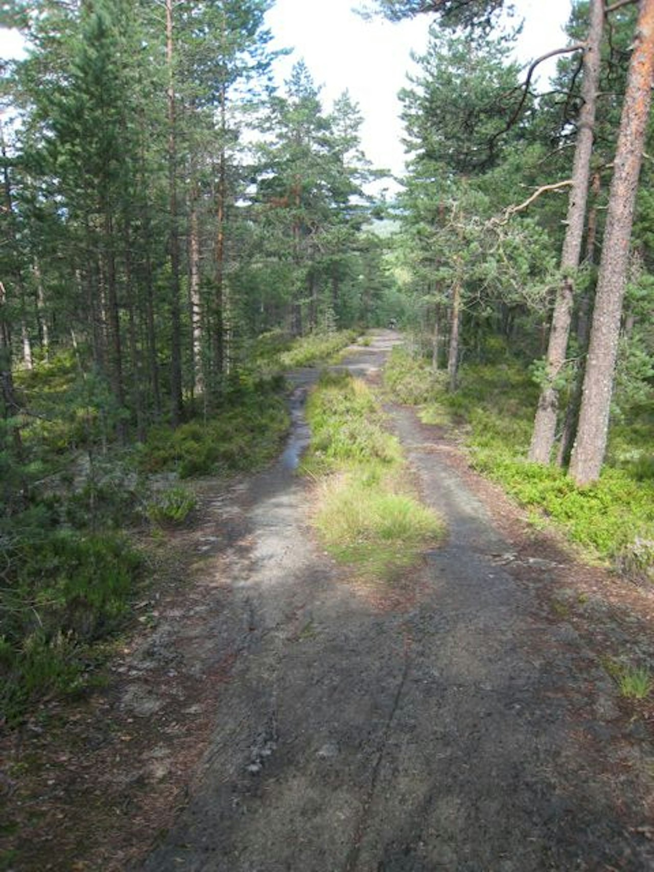 I begynnelsen av turen er det mest jordbunn med røtter, men med steinete partier og svaberg innimellom. Slutten, som er høydepunktet på turen, er en morsom nedkjøring på fine svaberg i åpent terreng.