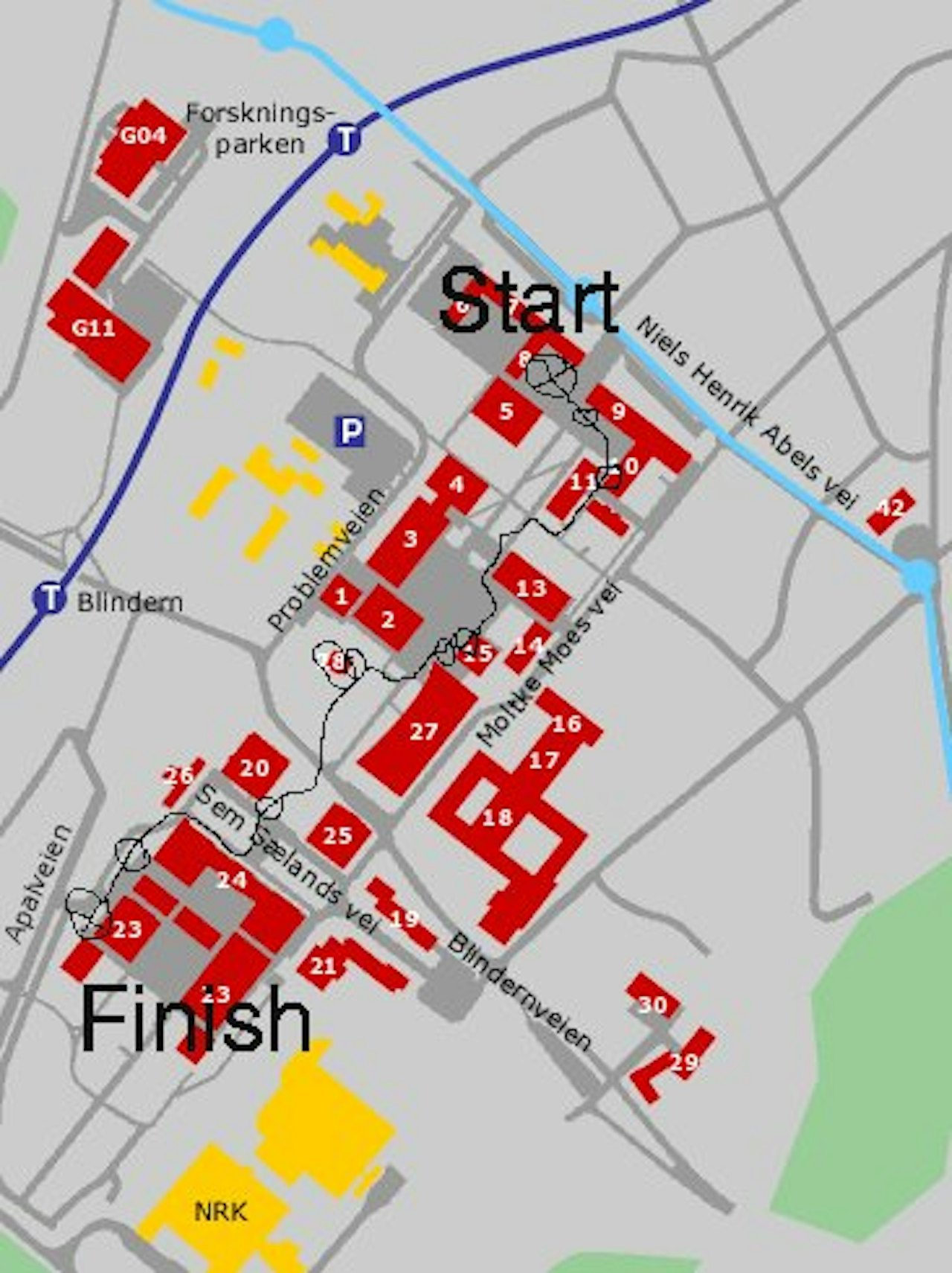 Dra'n nå ut trappa utenfor Helga Engs, pass litt på for biler, eksamensvakter, unger, mødre med vogner og andre tullinger. Kjør så ned mot fysisk (Hus 24). Ta'n så til høyre (som vanlig), følg så veien.