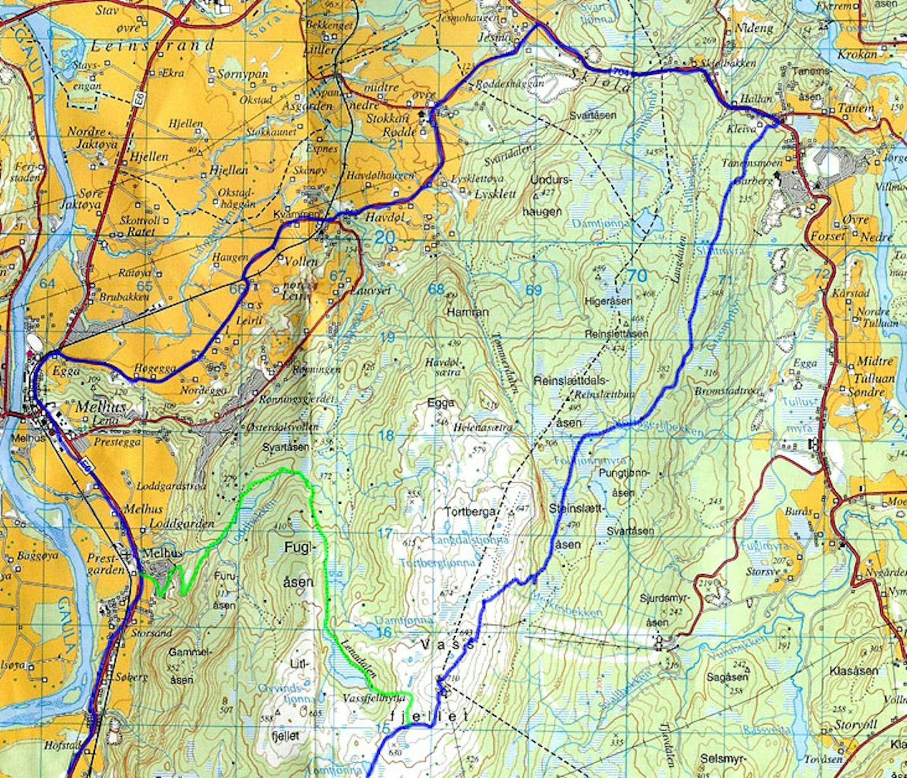 Herfra klatrer du jevnt og trutt opp til de drøyt 700 meterne på toppen mens du nyter utsikten. Veien stiger nokså ujevnt, men det er ingen virkelig bratte partier. Jeg har tatt den med singlespeeden i 2:1 utveksling flere ganger. Etter hvert tar det av en sti til Vassfjellhytta (grønn linje på kartet), som du ikke bør ta. Den nederste halvdelen av denne er veldig artig, men dessverre er den øverste delen akkurat det motsatte. Vi snakker om flere kilometer med vassing i myr før det begynner å bli gøy her. Går muligens an sent på høsten når barfrosten har fått taket.