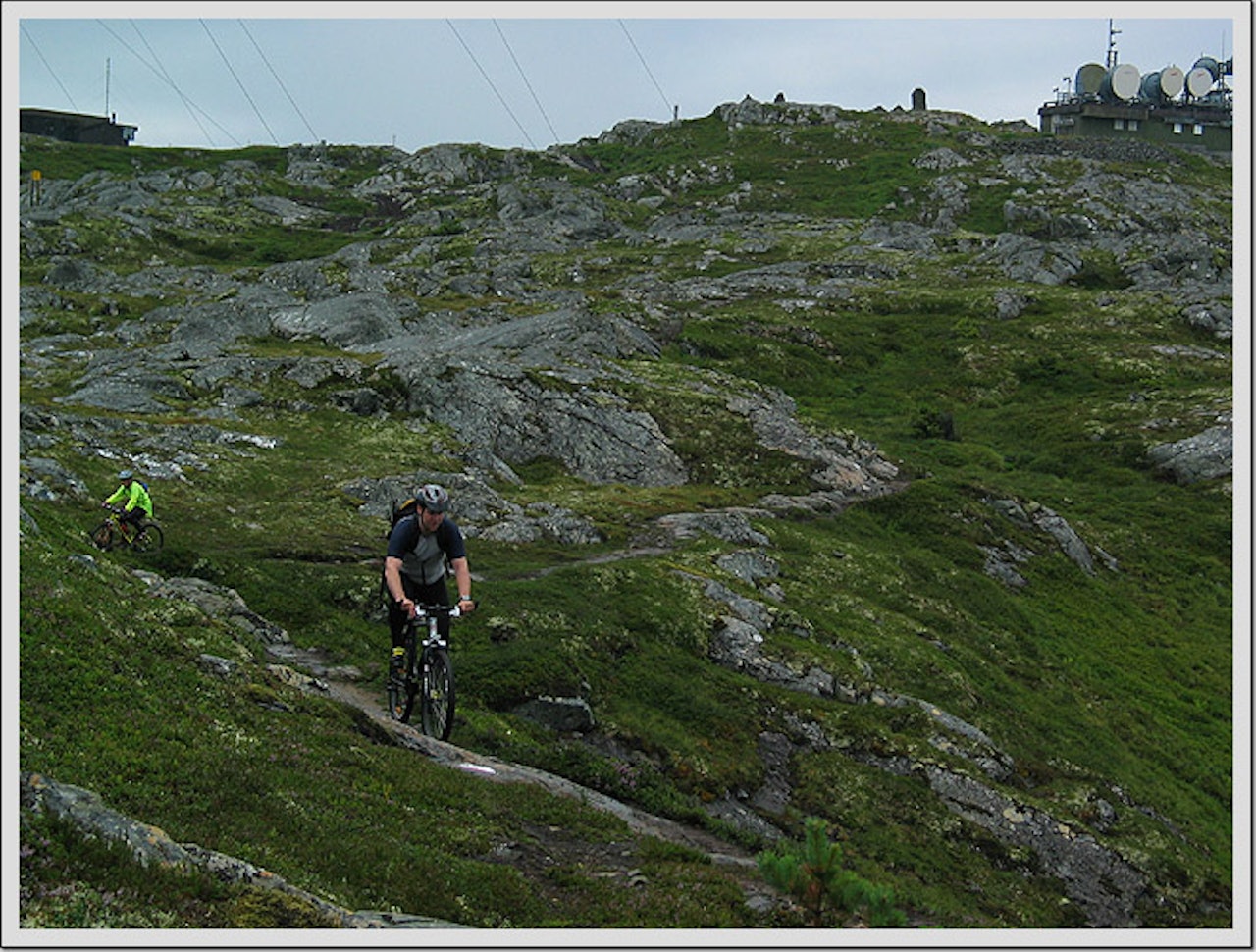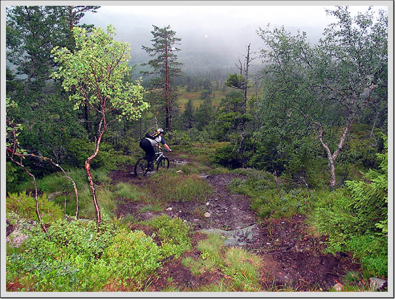 OK - du fant den. Skru ned setet her, for nå blir det bratt. Heretter er det bare å slippe på og ha det moro nedover den bratte, steinete lia før du kommer ned på fartsetappene over myra. Over myrene er stien godt drenert med grøfter langs med og over stien. Mange av grøftekrysningene kan du rulle gjennom, andre må du ta fart og hoppe over. Moro!