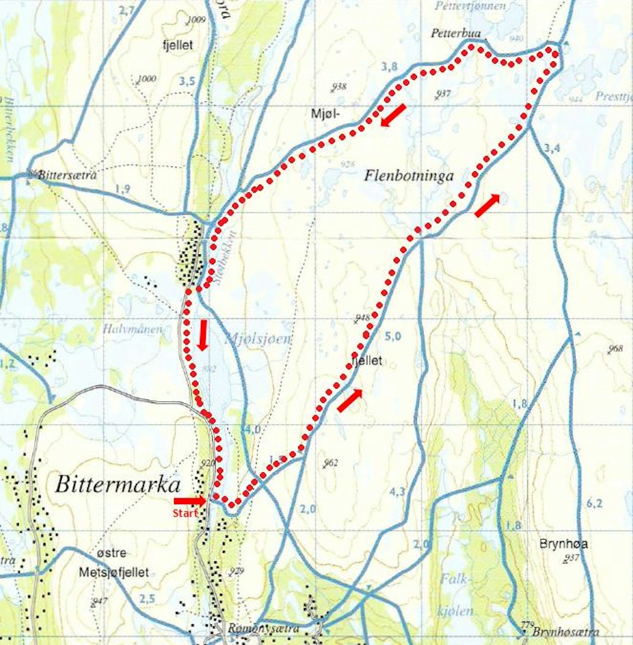 Ved sørenden av Mjølsjøen følger man stien over den lille demningen ved sjøen. Bekken etter demningen har ikke bro, så avhengig av vannføring må man vasse/sykle/bære. Bekken er uansett ikke dyp. Etter bekken fortsetter man på blå sti rett frem. Det går flere kryssende stier som man ikke skal ta. Etter ca en km er det viktig å følge den blå stien mot venstre. hvis man sykler rett frem mot en synlig varde og fortsetter innover havner man på en blindsti.Ved Flenbotninga passerer man over bekken på en trebro.Etter kjernet Presttjønna tar man til venstre i stikrysset og kommer til Petterbua. Petterbua er en liten ubetjent hytte som er ulåst og åpen for alle. Det finnes ved og en vedovn inne i hytta. Fra Petterbua sykler man mot Støtriset. Fra Støtriset går til grusvei tilbake til utgangspunktet ved Mjølsjøen. Alternativt kan man sykle blåsti på motsatt side av sjøen.