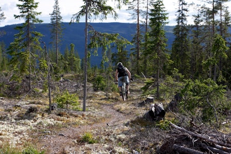 Høykvalitets valdres-sti fra topp til bunn. Fra oven: Litt steinete sti gjennom hogstfelt. Deretter på oppbygd kløvsti og hårnålssvinger. Ett vått parti med steiner som kan være sleipe. Resten: God flyt på smal, men jevn skogssti til du når grusen igjen. Det er mulig å sykle et stykke oppover, men etterhvert er det hike-a-bike til topps. Stort sett er stien så fin at det er null stress å trille sykkelen. Ei lita grind må forseres, ellers er det ingen grunn til å gå av sykkelen på tur ned. Alt i alt ca 400 høydemeter med veldig bra sykling!