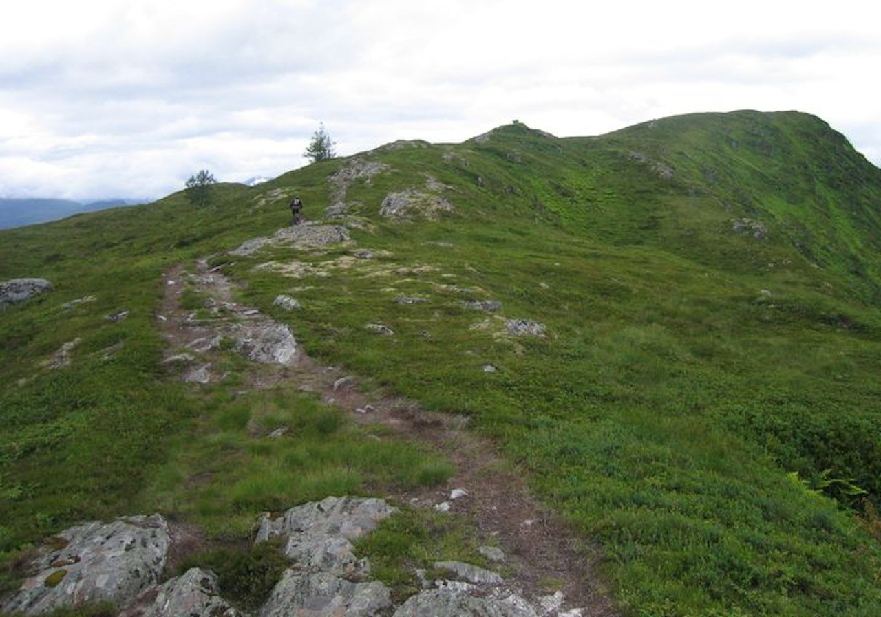Herfrå går det nedover. Først på lett teknisk sti, før farta gradvis kan aukast når underlaget blir slettare. Det er fortsatt berre ein sti og velge mellom, så det bør by på store problem å miste denne her.
