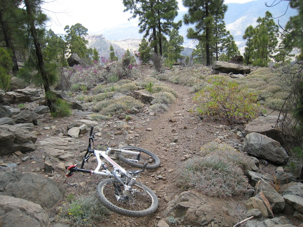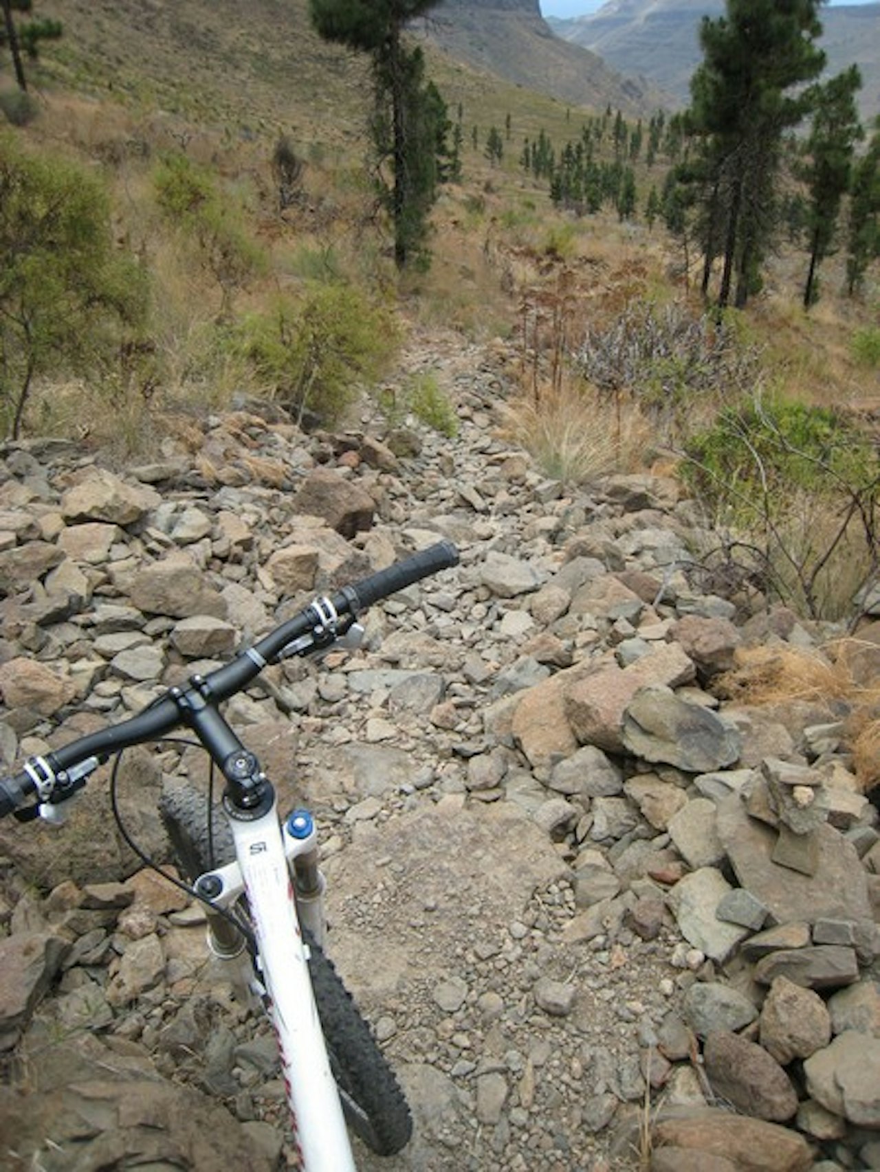 Fantastic route that starts at Cruz Grande with flowing and twisty gravel, then slightly scary and rocky singletrack on ledges and flowing hillsides to the dam in Ayagaures. The last 10km on asphalt to Maspalomas. The view was fantastic and the singletrack rocky and technical. This route originally starts at Pico de las Nieves, another 700 vertical meters further up.This route is not on any of the trips offered by the tour operators as it is considered to be too challenging with regard to technical difficulty on the singletrails. It is challenging in sections, but just take it easy and you'll manage.Get to the Cruz Grande pass and take the trail/gravel road that starts on the right side off the cliff (not facing San Bartolomé), then follow for a few kilomtres to the panoramic viewpoint where you look out over the San Bartolomé-valley. Follow the Maspalomas sign and after 200m there is a trail starting to the right and slinging it's way down. In the second turn, go straight ahead and follow the singletrail along the hillside (still heading towards the ocean). Get ready for some amazing views and epic riding!When you get close to the dirt road in the valley you will see some black plastic water pipelines. Cross over to the road and follow for another 300m past the pumphouse and two very small dams. Then the trail drops to the right again (straight ahead is a dead end). You'll ride along the hillside to Ayagaures and cross the dam there. Take a break at the bar by the church. You've completed around 20km of singletrail!Due to the rocks on the trail and plants and bush by the trail I recommend to use arm and knee-proctectors (full length is optimal).PS! From the start of the single trail there I had no cell-phone coverage untill Ayagaures. Keep it in mind, especially if you ride solo.See the excellent hiking trail maps from www.kompass.at which can be bought at the www.free-motion bike shops. Be aware that not all trails on this trip are on that map either.
