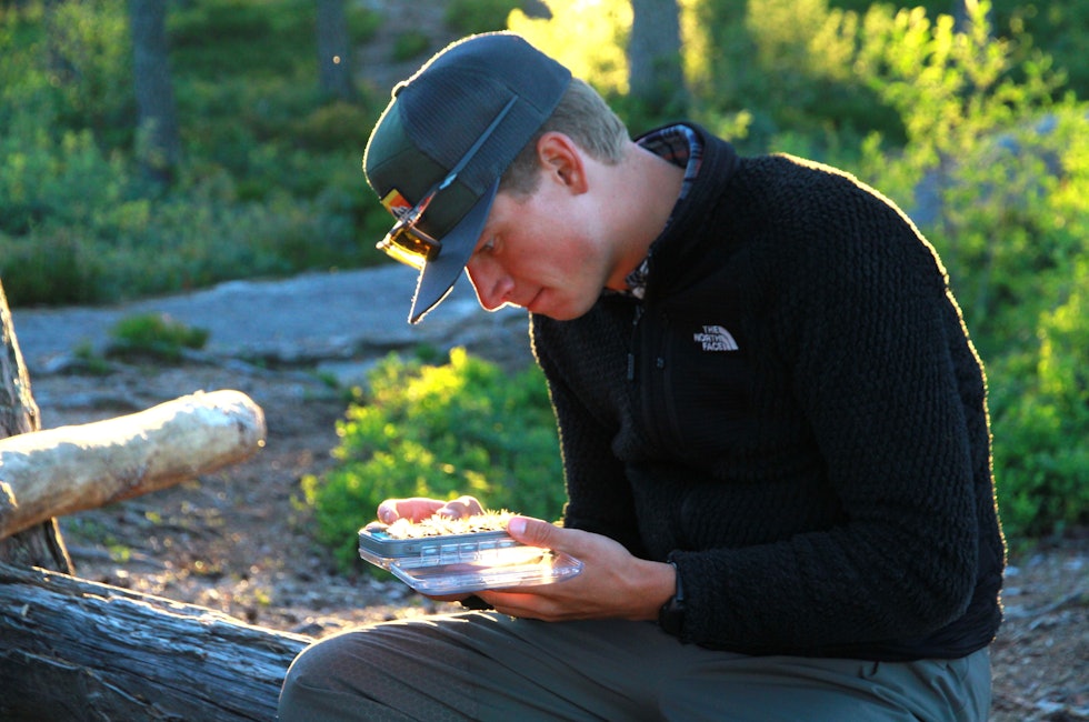 – Skal vi begynne å tenke på å ta turen hjemover? spør Røhme.Han kikker ned i flueboksen og skulle ønske han hadde svaret på hva ørreten ville ha.