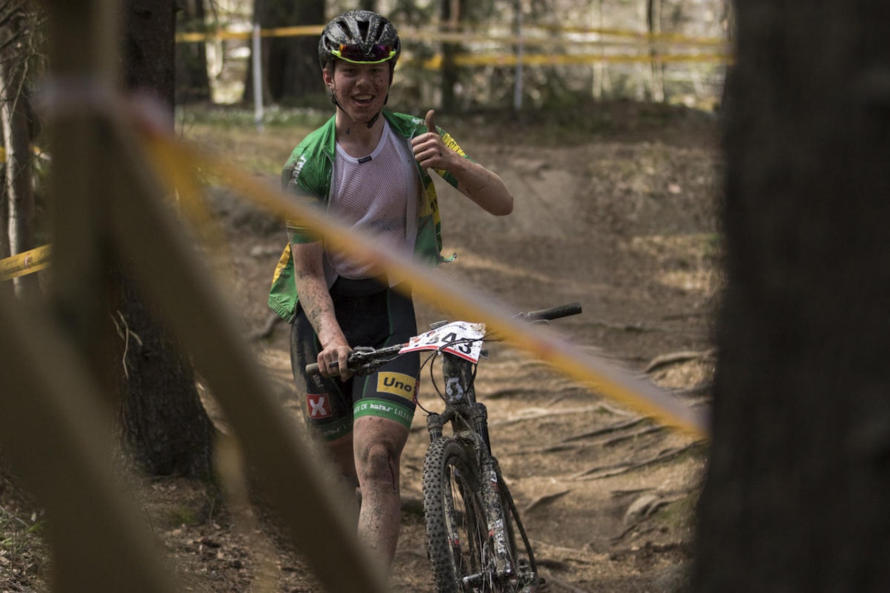 Kevin Panhuyzen fra Belgia fikk kjøre seg i typisk norske løyper med mye røtter og stein på UCI-rittet i Menn Senior.