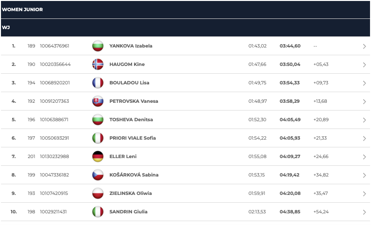 Av de norske var det Kine Haugom som hevdet seg sterkest i konkurransen, med en andreplass i klassen kvinner junior. I mål var hun litt over fem sekunder bak vinneren Izabela Yankova fra Bulgaria.